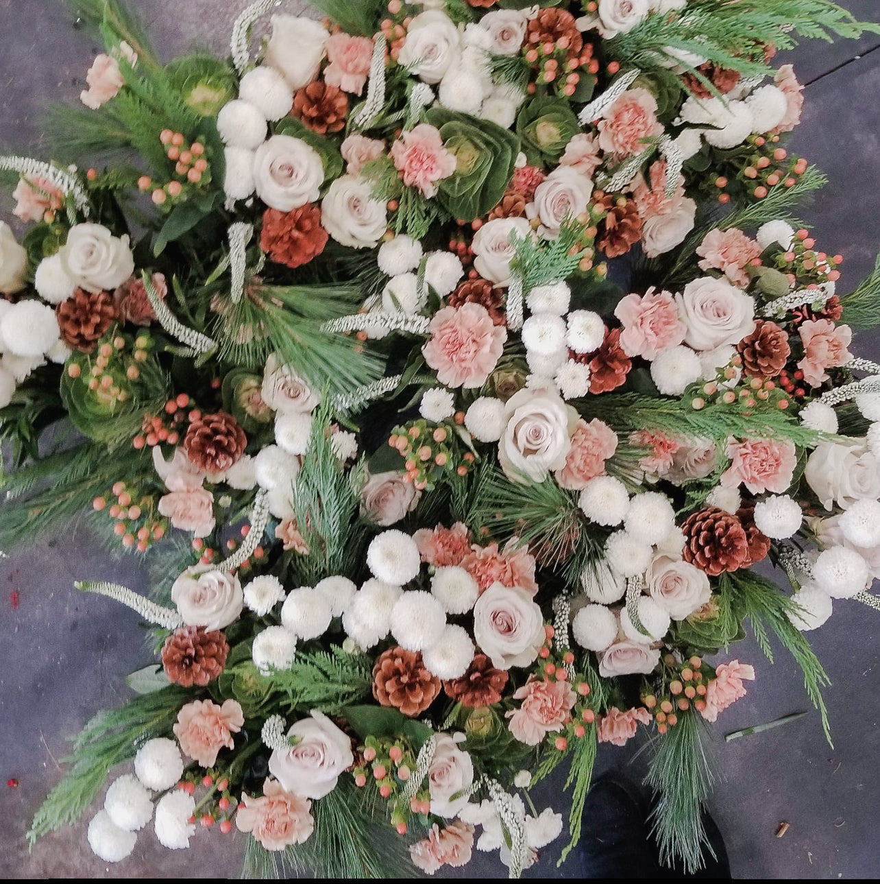 Flower favourites may include some of the following: a mixture of greens, berries, roses, carnations, ranunculus, daisies, alstromaria, lisianthus, stocks and disbuds just to name a few.