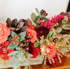 A favourite Thanksgiving centrepiece. The Muskoka Harvest arrangement has all the deep colours and gorgeous textures of the season. Some of our favourites included are Roses, Dahlias, Berries, Eucalyptus, Mums, Amaranthus, and an assortment of greenery. All arranged beautifully in a wooden container.