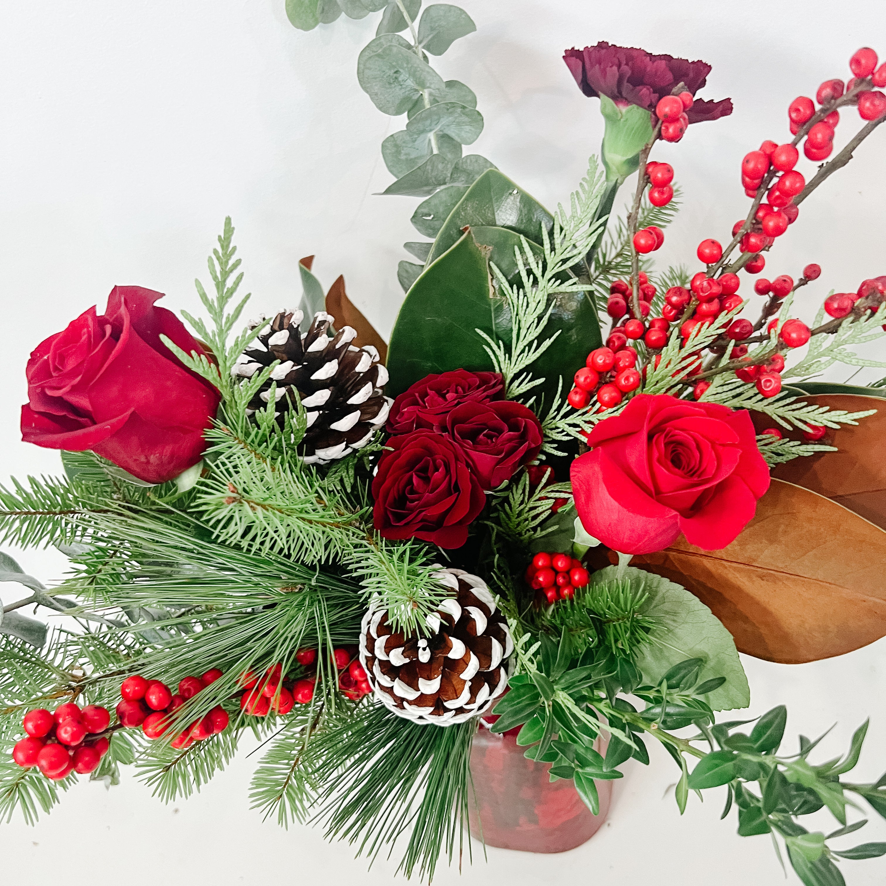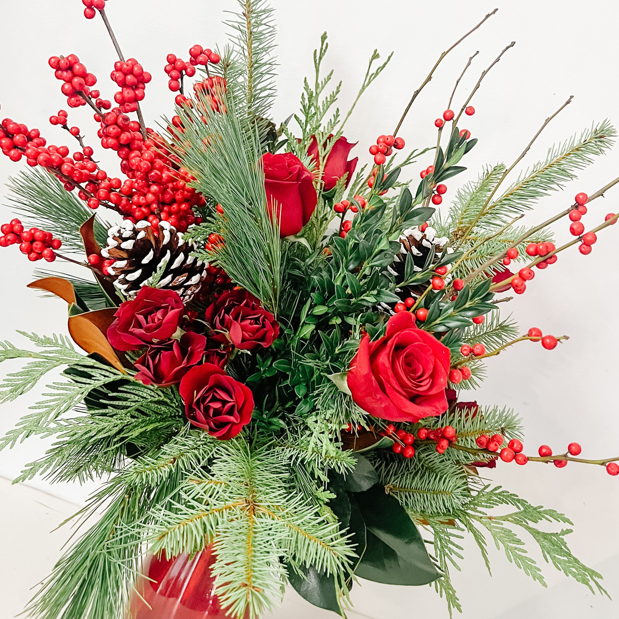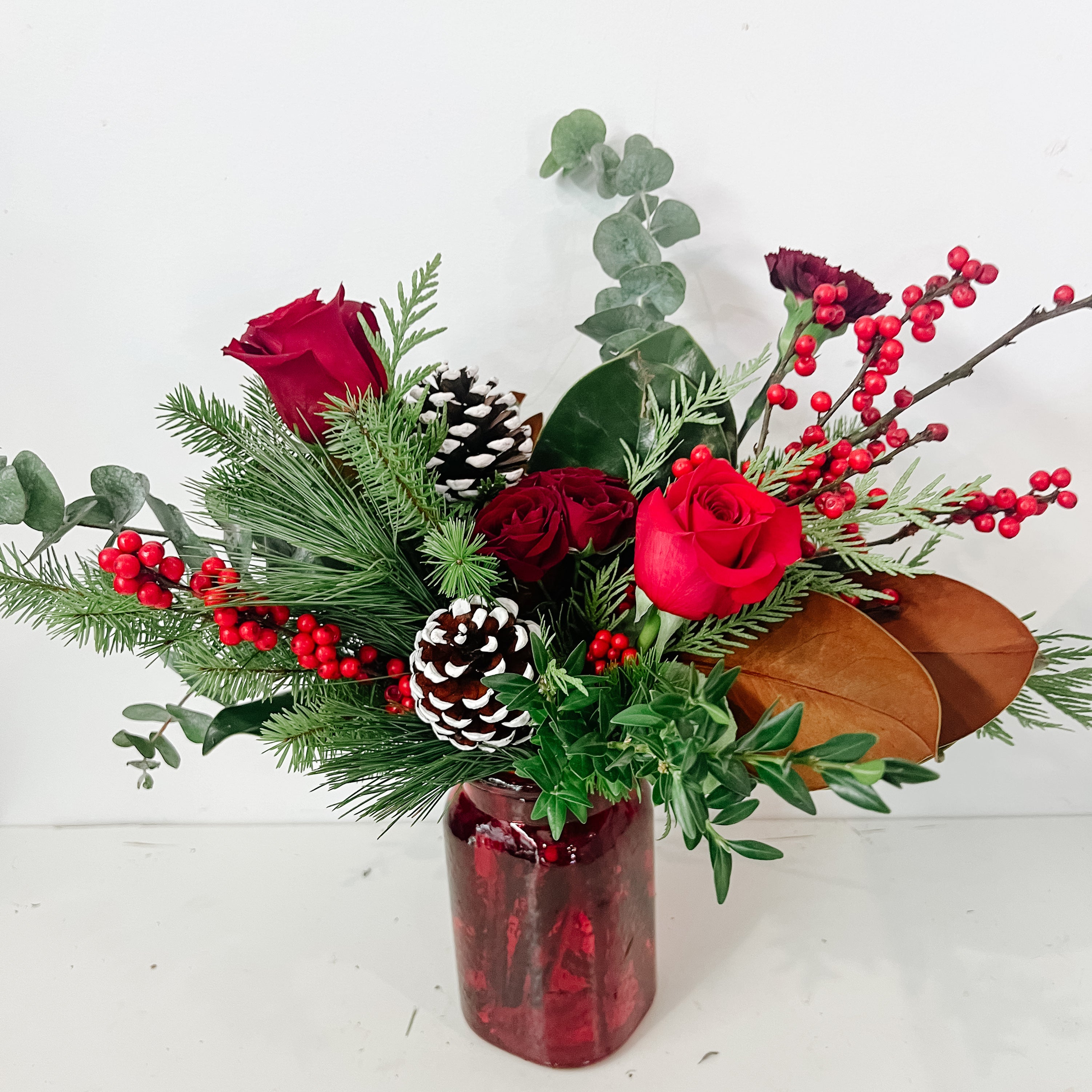This beautiful red vase full of seasonal greenery and festive red flowers, such as roses, carnations, red berries, and pinecones.