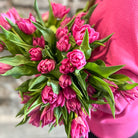 Beautiful, fluffy pink double tulips wrapped in bouquet