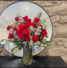 Prepare for a breathtaking statement with our exquisite vase filled with two or three dozen passionate red roses. Enhanced by the lush elegance of eucalyptus greenery, this arrangement is not just a gift; it's a profound expression of love that is sure to leave your special someone truly impressed.