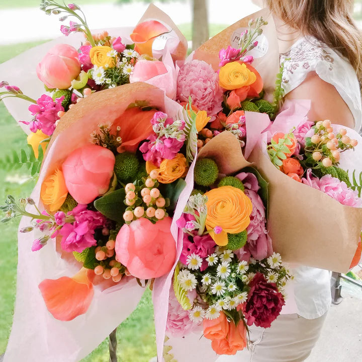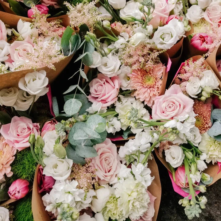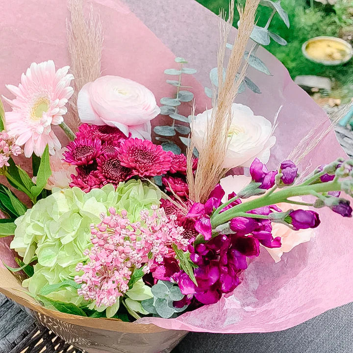 Flower favourites can include a mix of greens, berries, roses, carnations, ranunculus, daisies, tulips, alstromaria, Stocks, delphinium, lisianthus, peonies, hydrangeas, anemones, disbuds just to name a few. Too many favourites too list but we promise you won't be disappointed.