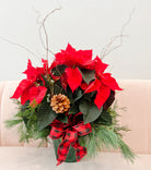 BIG and beautiful 6” or 8” Poinsettias in Red, Pink or White. Poinsettia includes a touch of evergreen, pinecones and bow.