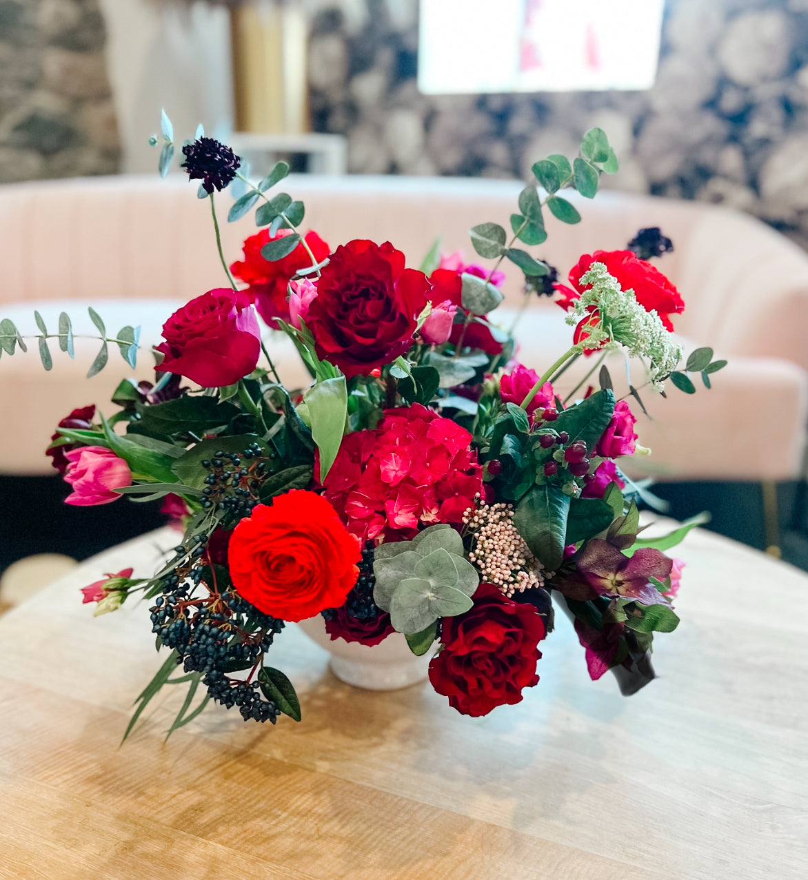 This striking arrangement is full of moodiness, colour and texture. With an abundance of flowers (which may include, ranunculus, berries, hydrangeas, lisianthus, roses, carnations, rice flower, clematis, stocks and tulips) and a compote, get ready to wow your loved one.