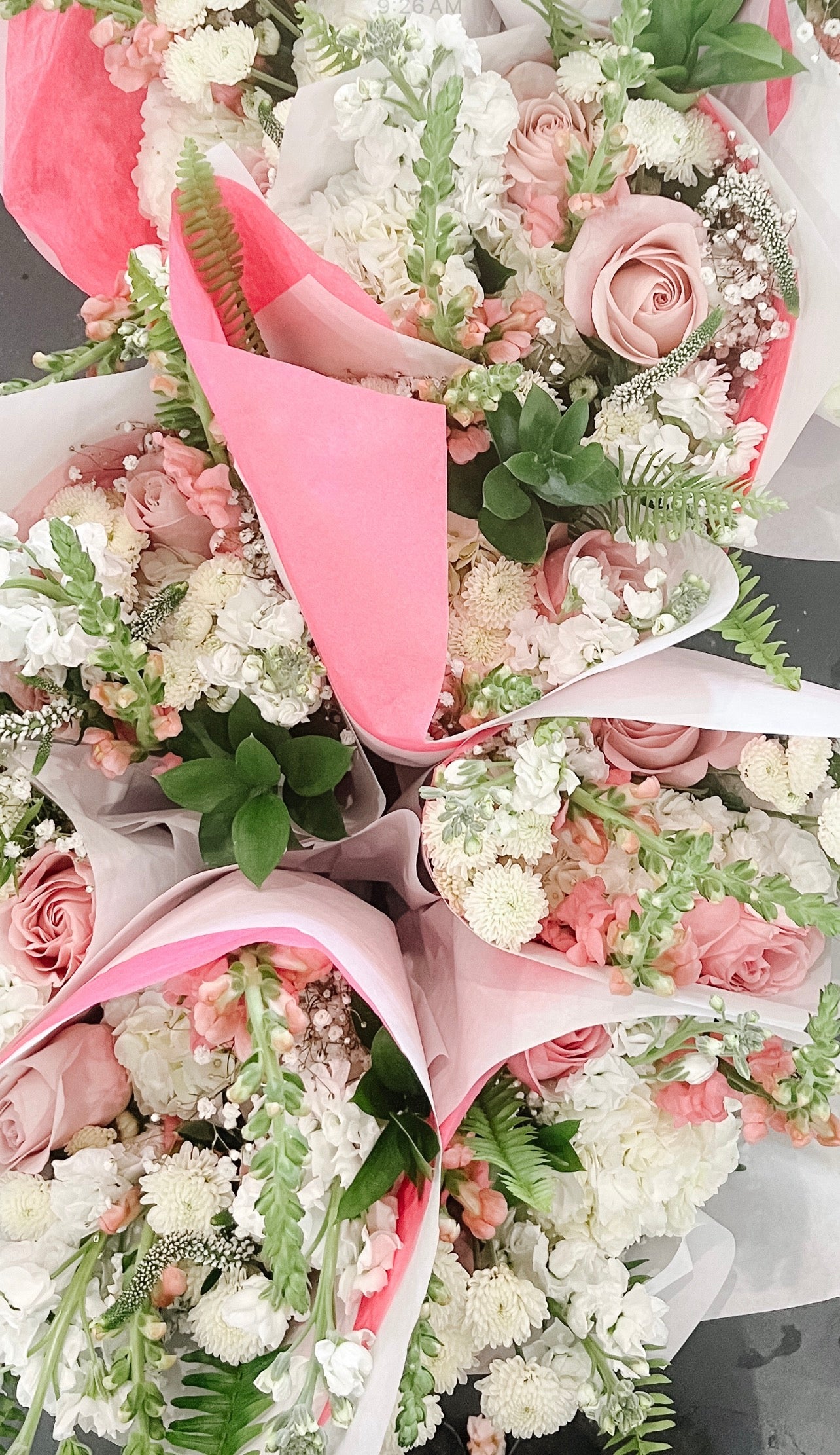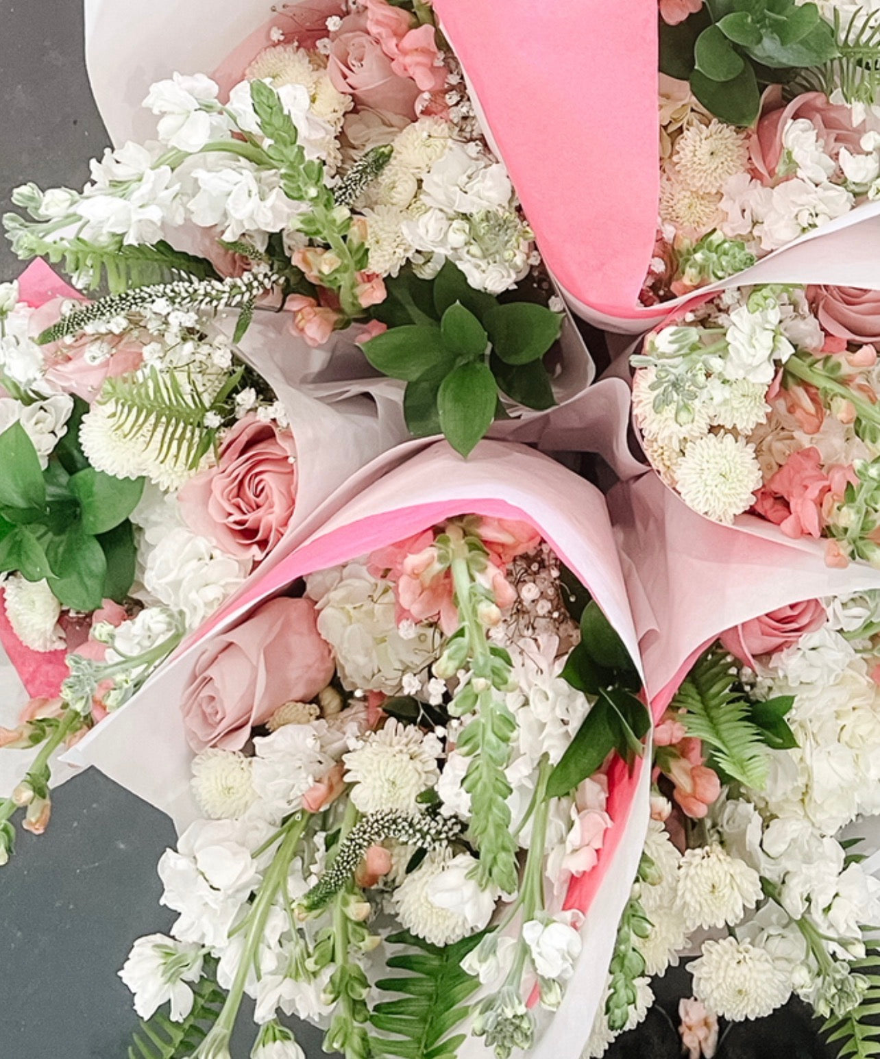 Flower favourites can include a mix of greens, berries, roses, carnations, ranunculus, daisies, snap dragons, stocks, tulips, just to name a few. Too many favourites too list but we promise you won't be disappointed.
